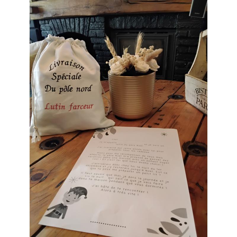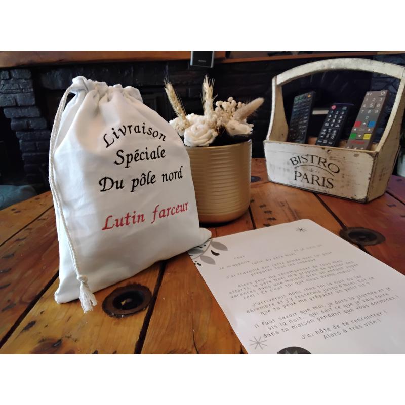 Sac a lutin mesure 25x30 cm avec broderie machine , personnalisable " prenom" sur demande. Avec une lettre ... attention pas de lutin fournis avec .