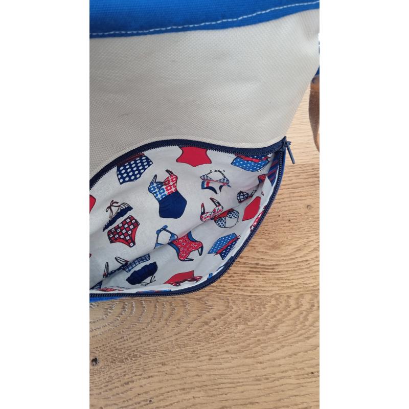 Mais c'est à l'intérieur que la surprise se révèle — une doublure à motifs maillots de bain vintage rouge, blanc et bleu, joyeuse et pleine de caractère, comme un clin d'œil aux estivantes d'antan. Un trésor caché que vous serez la seule à connaître... ou à montrer.