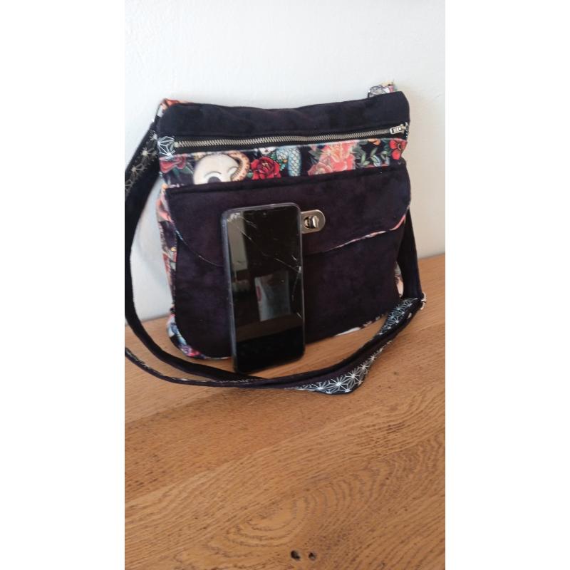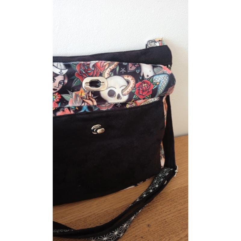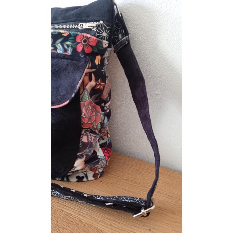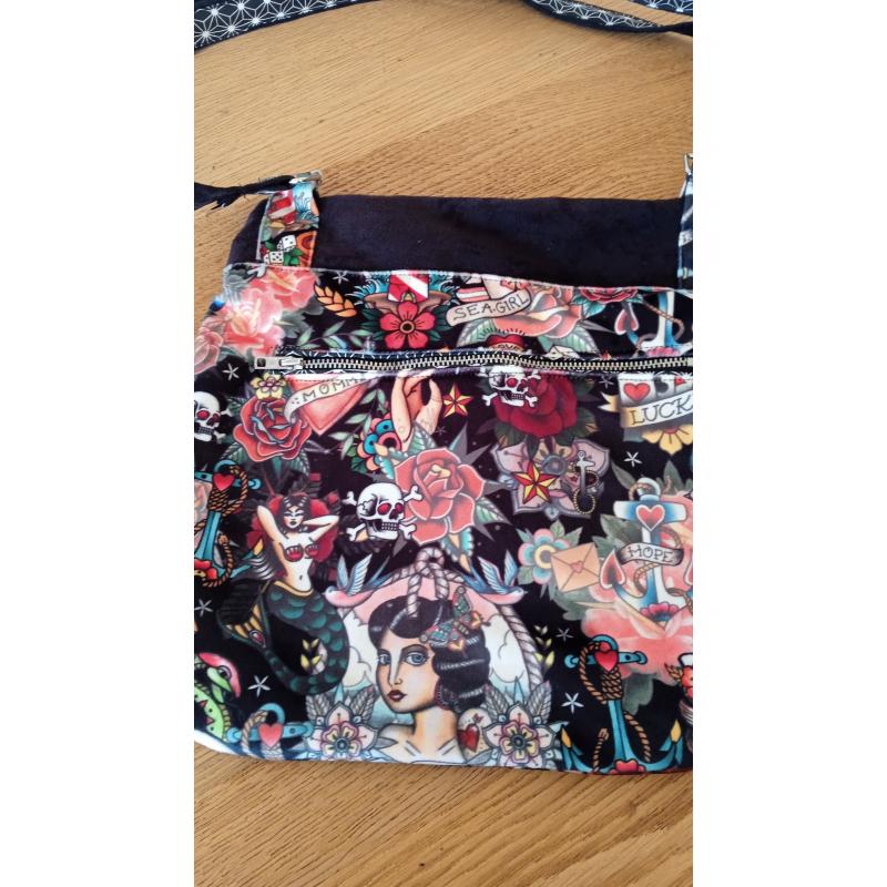 Ce sac bandoulière fait main allie le velours noir profond et soyeux à un imprimé tatouage old school — pin-up sensuelles, roses rouges, sirènes et fleurs sauvages — comme une galerie d'art portée à l'épaule.