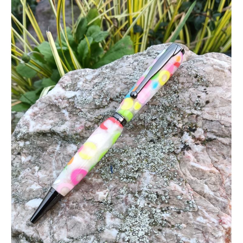 Stylo bille en résine blanche avec inclusion de perles acrylique. Mécanisme quart-tournant en gun métal.