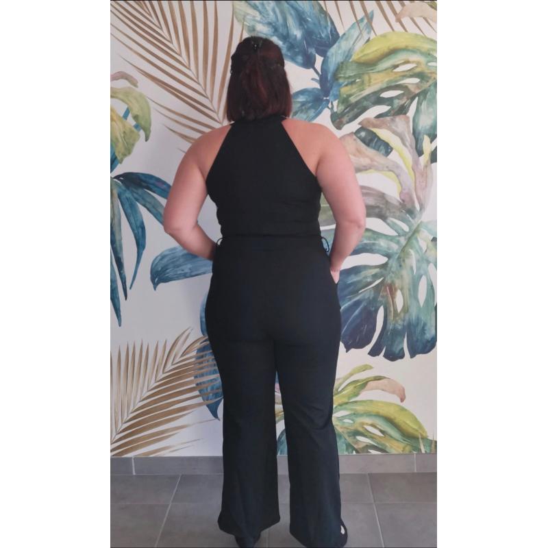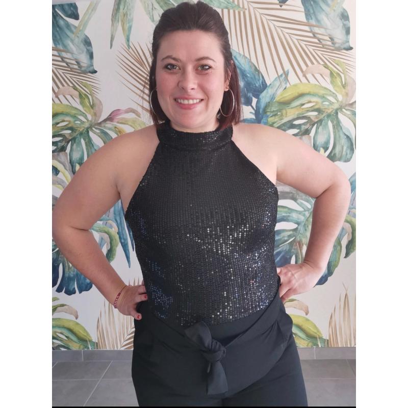 Combinaison élégante avec son haut en sequins noirs scintillants et son pantalon taille haute fluide avec sa coupe droite.