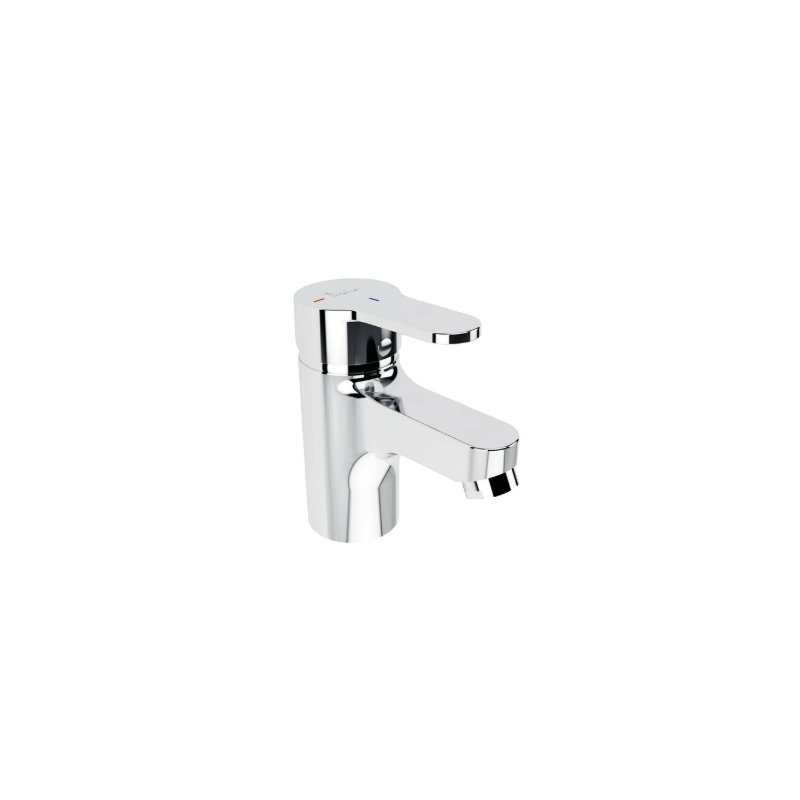 Porcher. Olyos. Mitigeur lavabo monotrou chrome. Bec fixe avec aérateur intégré. Tirette côté droit. Cartouche Ø 40 mm à 2 disques céramique. avec limiteur de température intégré et limiteur de débit 50 % déverrouillable. BlueStart : ouverture eau froide en position centrale. Flexibles d'alimentation anti-torsion 350 mm.